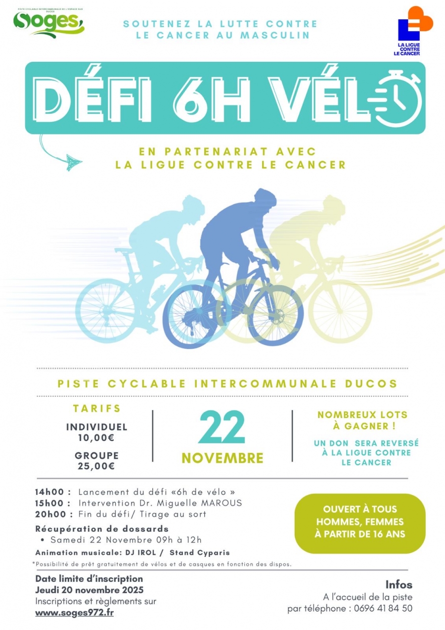 Ensemble contre le cancer au masculin ! La SOGES organise, en partenariat avec la Ligue contre le cancer, un grand défi sportif et solidaire : 6 heures de vélo sur la piste cyclable intercommunale de Ducos