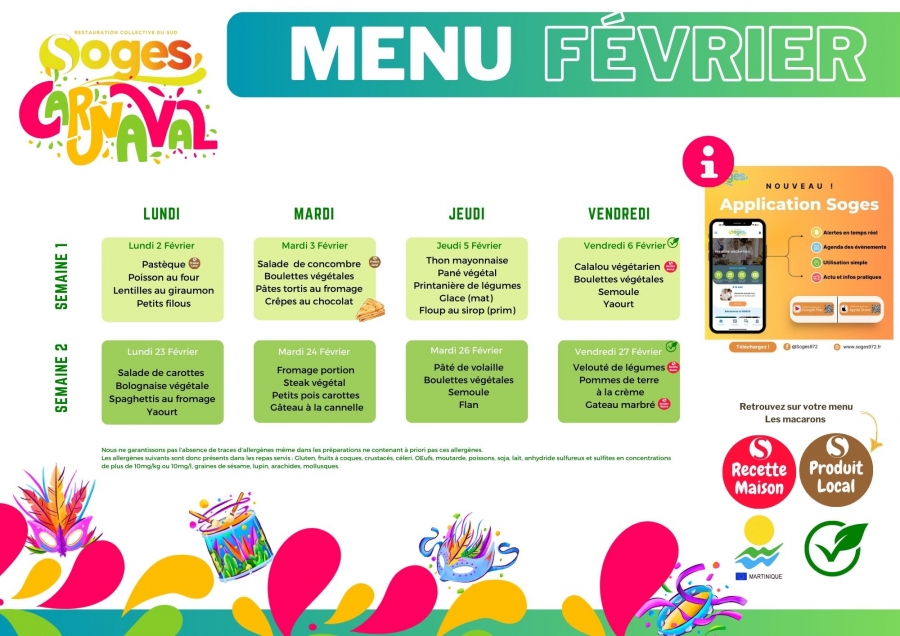 Téléchargez le menu sans viande de Février 2026 des écoles maternelles et élémentaires du sud de la Martinique !