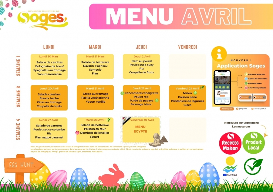 Téléchargez le menu de avril 2026 des écoles maternelles et élémentaires du sud de la Martinique !