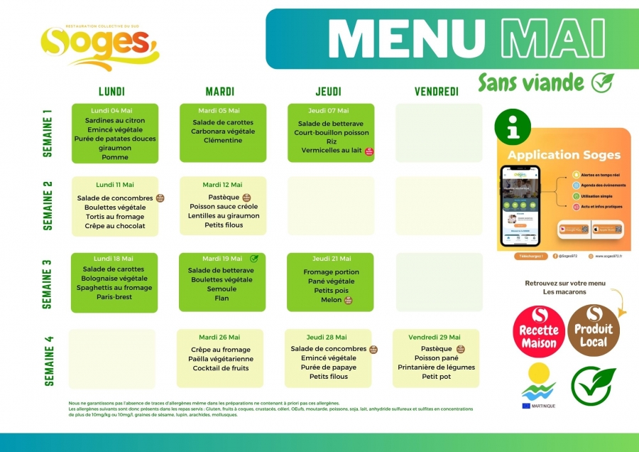 Téléchargez le menu sans viande de Mai 2026 des écoles maternelles et élémentaires du sud de la Martinique !