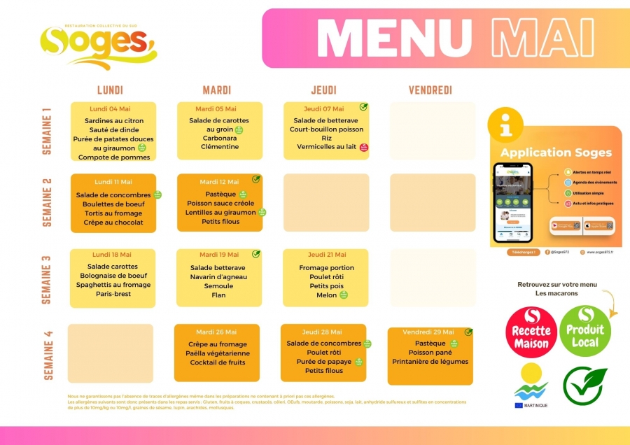 Téléchargez le menu de Mai 2026 des écoles maternelles et élémentaires du sud de la Martinique !