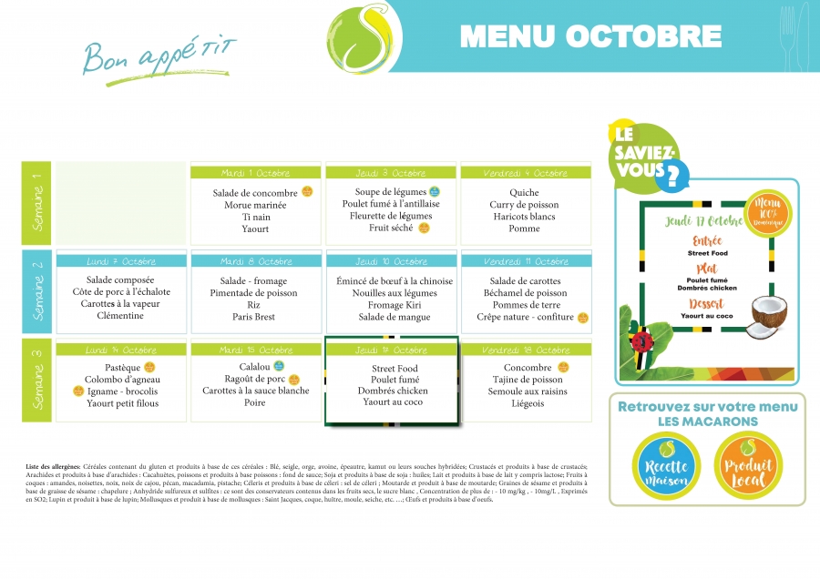 Télécharger le menu du mois d'octobre 2019 des écoles maternelles et élémentaires du sud de la Martinique