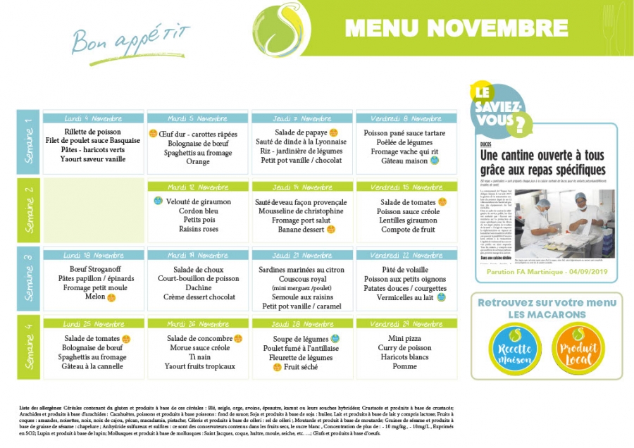 Télécharger le menu du mois de novembre 2019 des écoles maternelles et élémentaires du sud de la Martinique