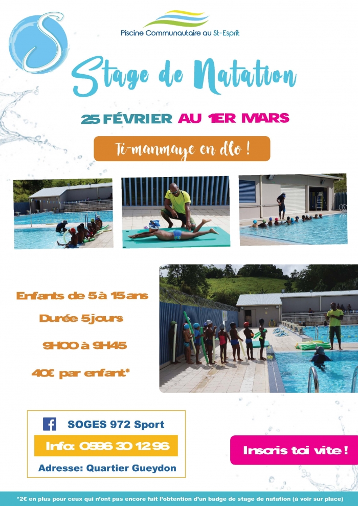 Du 15 au 18 avril 2019 Stage de Natation de Pâques pour les enfants de 6 à 12 ans de 9h00 à 10h00Informations complémentaires :Tarif : 40 euros Contactez Nous : 0596 30 12 96