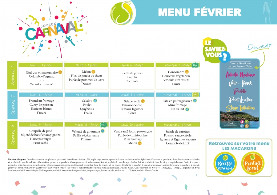 Télécharger le menu du mois de Février 2020 des écoles maternelles et élémentaires du sud de la Martinique