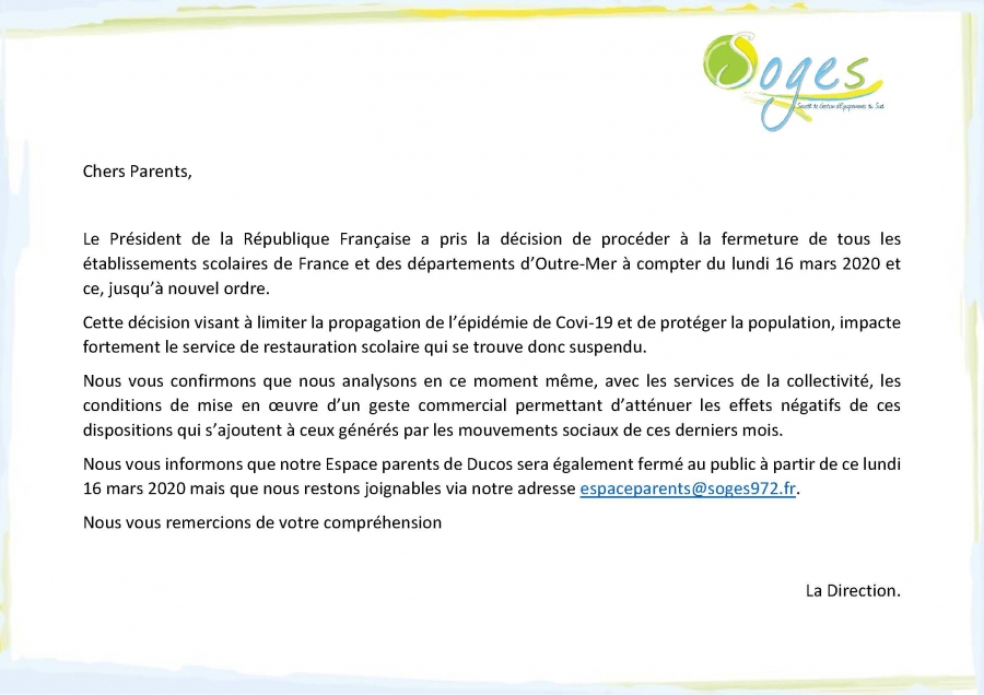 Chers Parents,Ci-joint le communiqué diffusé suite à la décision du gouvernement, visant à limiter la propagation de l’épidémie de Covi-19