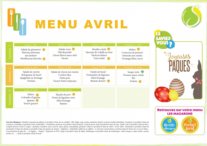 Télécharger le menu du mois d'Avril 2019 des écoles maternelles et élémentaires du sud de la Martinique