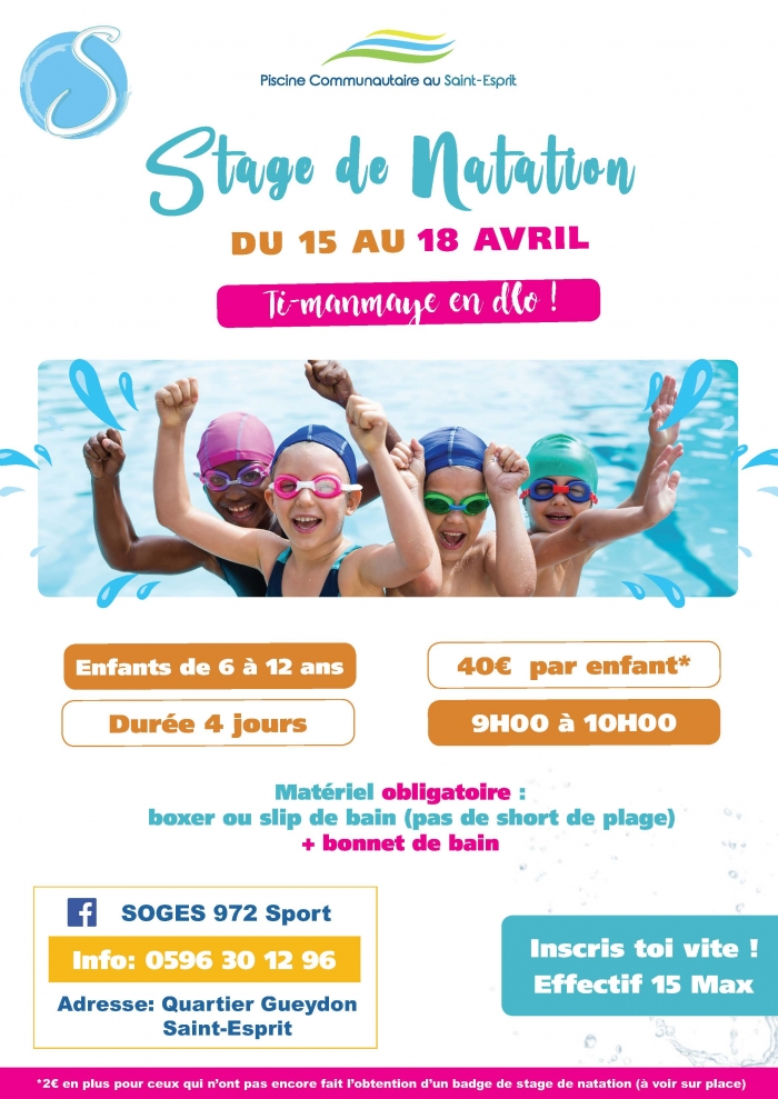 Du 15 au 18 avril 2019 Stage de Natation de Pâques pour les enfants de 6 à 12 ans de 9h00 à 10h00Informations complémentaires :Tarif : 40 euros Contactez Nous : 0596 30 12 96