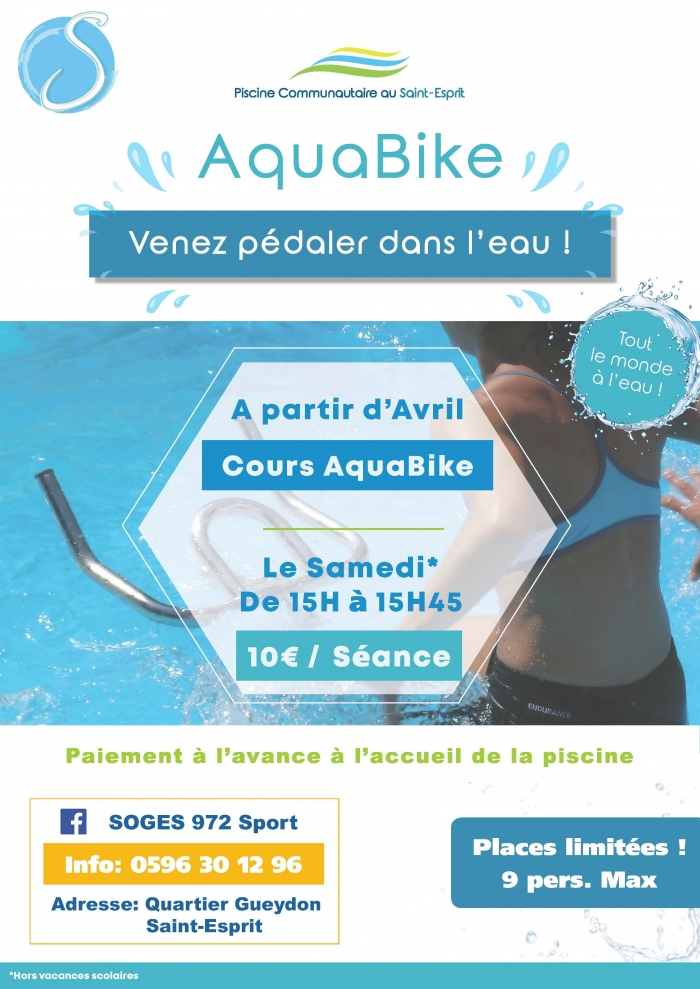 Venez pédaler dans l'eau avec nos cours d'Aquabike tous les samedis de 15h00 à 15h45Cours d'Aquabike tous les Samedis de 15H00 à 15H45Tarif: 10 euros la séanceInfo : 0596 30 12 96